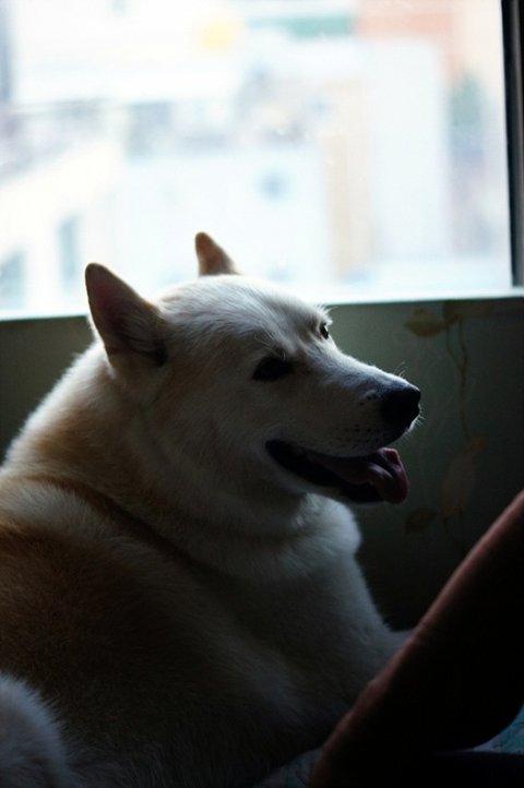 또 나가고 싶어서 창문밖을 쳐다보고 있어요.