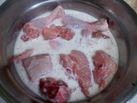 1. 치킨 냄새 잡기 + 염지 : 일단 닭을 우유에 담궈놓고 1~2시간 정도 두면 잡내가 없어지고 살이 연해진답니다. 라고 배움