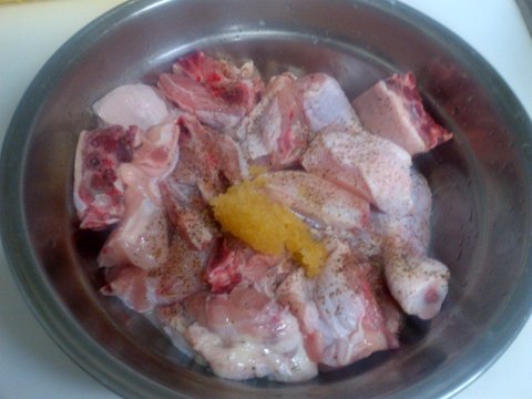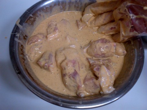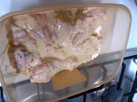 2. 염지 : 우유에서 건저낸 닭을 후추, 다진마늘, 소금약간, 설탕조금, 양파를 넣고 조물조물 한 후에 랩으로 씌워서 적게는 1~2시간 많게는 하루 염지하신 다는 분들도 있고 다양하지만 저는 3시간동안 염지. + 기호에 따라서 카레가루나 월계수잎을 넣어도 됩니다.