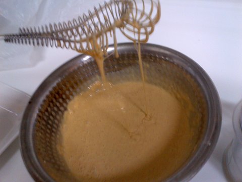 농도는 아래 사진과 같이 주루루루룩 늘어나면서 떨어져야되요. 뚝뚝 끊어지면 묽고요 너무 진득하게 떨어지면 튀김옷이 너무 퍽퍽합니다.