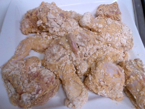 그리고 마지막으로 치킨파우더를 반죽입힌 닭에 한번 더 입혀줍니다.