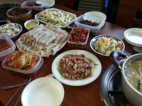 오리 무쌈말이, 어묵국, 과일 샐러드, 닭가슴살 샐러드, 인스턴트 오리 훈제