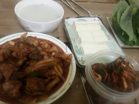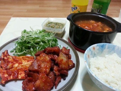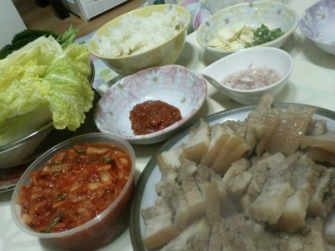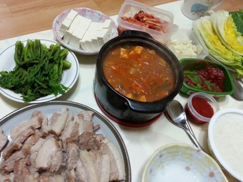 삼겹살 수육이랑 데친 두릎, 된장 찌개에요. 혼자 먹은거 같지만..아니에요..ㅠ
