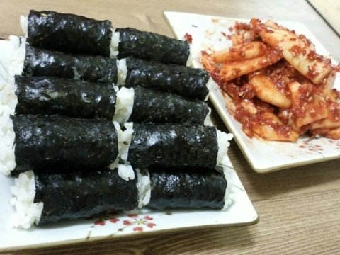 김밥은 참치, 청양고추참치, 치즈, 깻잎, 김치, 그냥 김밥 이렇게 다섯가지 맛이에요...