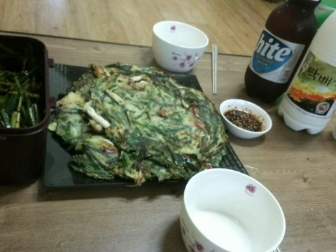 비오는날.. 오징어 부추전,, 왼쪽 귀티에 보이는건 남은 부추로 만든 부추무침인데