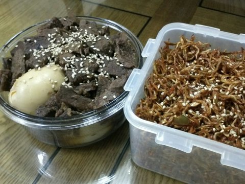 메츄리알이 없어서 그냥 달걀이랑 소고기랑 장조림한거랑 고추장 멸치볶음이요.