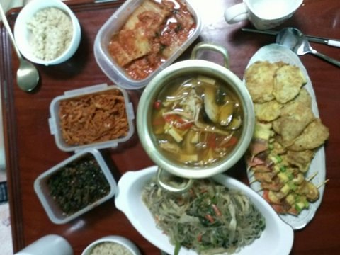 버섯전골, 꼬치랑 동태전, 잡채인데요
