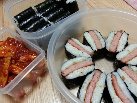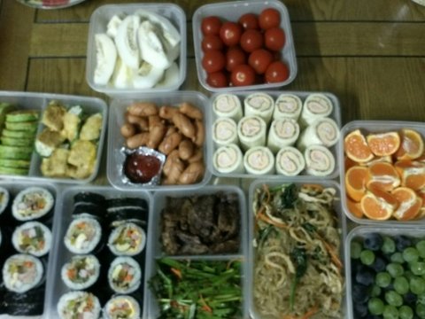 호박전, 고추전, 비엔나, 롤샌드위치, 김밥, 소고기 간장구이, 부추무침, 잡채, 과일