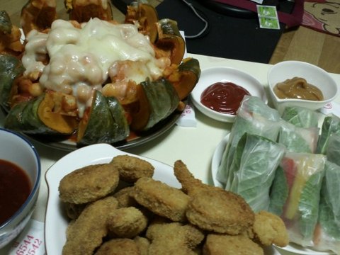 단호박 치즈 떡볶이, 스프링롤, 치킨너겟