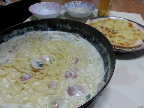 청양고추 넣은 까르보나라랑 고르곤졸라 피자에요..