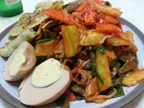 비빔만두에요. 저기 계란은 제가 밥솥으로 만든 구운계란이에요. 쫄깃쫄깃 맛나욤