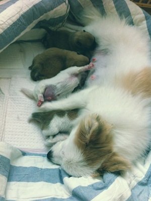 검지는 파티컬러 (얼룩)무늬를 가지고 있었고, 교배 상대인 몽식이는 화이트여서