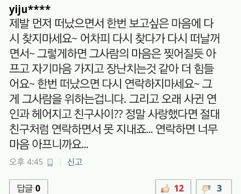 이제 한달 지남 한번도 안잡아준 그사람이 너무나 미웠음 하지만 나는 나를 사랑하지 않는 사람을 놓친거지만 그사람은 자기자신을 사랑해..