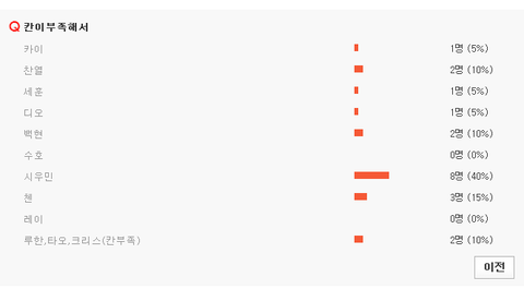 총 투표 수 95 l 기간 2013.10.23 ~ 2013.10.30 18:32:29김민석17.9% 17표김루한5.3% 5표구리수4.2% 4표 √김준면7.4% 7표장이씽2.1% 2표변백현16.8% 16표김종대7.4% 7표박찬열4.2% 4표도경수14.7% 14표김종인7.4% 7표황자도3.2% 3표오세훈9.5% 9표비회원/레벨9는 비회원 투표이며 회원으로 재참여 가능합니다