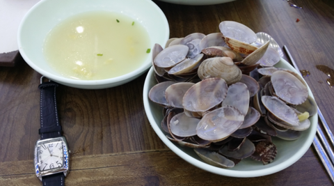 칼국수와 겉절이, 수없이 쌓인 바지락을 음미하는 친구1