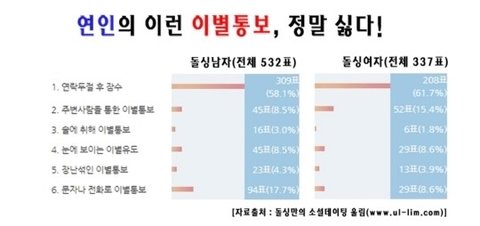 회원들을 대상으로 '연인의 이런 이별통보, 정말 싫다!'라는 주제로 설문조사를 했습니다.