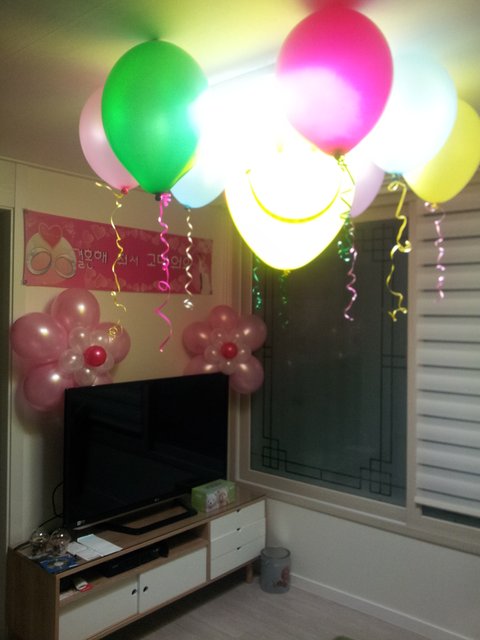 거실에 풍선!과 플랜카드!가 딱! 냉장고에 각종 반찬!들이 딱! ![]()