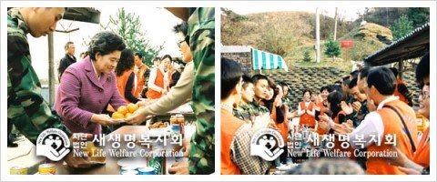 (왼)국제위러브유운동본부 장길자회장님/(우)국제위러브유운동본부 회원들- 주황색 조끼