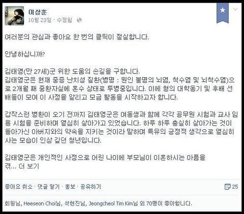 여러분의 관심과 좋아요 한 번의 클릭이 절실합니다.안녕하십니까?김태영(만 27세)군 위한 도움의 손길을 구합니다.김태영군은 현재 중증 난치성 질환(병명 : 원인 불명의 뇌염, 척수염 및 뇌척수염)으로 2개월 째 중환자실에 혼수 상태로 투병중입니다. 이에 형의 대학동기 및 후배 선배들이 모여 이 사정을 알리고 모금 활동을 시작하고자 합니다.갑작스런 병환이 오기 전까지 김태영군은 여동생과 함께 각각 공무원 시험과 교사 임용 시험을 준비하며 열심히 살아가고 있었습니다. 하루 하루 충실히 살아가는 것이 돌아가신 아버지와의 약속을 지키는 것이라 말하며 특유의 긍정적 생각으로 열심히 사는 모습이 인상 깊던 청년입니다.김태영군은 개인적인 사정으로 어린 나이에 부모님이 이혼하시는 아픔을 겪고, 아버지와 조부모님 그리고 여동생과 함께 자라왔습니다. 그러던중 안타까운 일은 홀로 남매를 키워오시던 김군의 부친께서 폐암 진단을 받고 암 투병을 시작하신 것입니다. 김 군은 이러한 상황에 굴하지 않으며 병상의 아버지를 약 2년 간 극진히 간호하며 학업에도 소홀하지 않았습니다. 대학시절 쾌할하고 성실한 모습으로 국립 강릉원주대학교 자치행정학과의 학회장직을 충실히 수행하였고 성적 우수 장학금도 놓친 적이 없었습니다. 아르바이트로 스스로 학비와 생활비도 마련하는 건실한 태도로 동기나 후배들의 모범이 되기도 했습니다.김군의 아버지께서는 김군의 간절한 노력과 바람에도 불구하고 작년 (2012년) 말 돌아가시게 되었고, 김군은 그 큰 슬픔을 채 추수르지도 못한 채 가장의 역할을 떠맡게 되었습니다. 그런 상황속에서도 희망을 잃지 않으며, 아버지께서 남겨주신 조그만한 분식점에서 나오는 적은 월세로도 동생과 생활하며 굳건히 여동생의 보호자로써의 역할을 해나가던 모습이 아직도 생생합니다. 그러던 와중에 조모님의 심장수술 같은 일이 생기고 역시 김군은 조모님을 간병하고 조모님의 건강을 찾는데 정성을 다하였고 또 한번 굳건히 자신을 다잡고 살아 가고있었습니다.그런 김군이 올 8월 말 경 극심한 투통과 감작스런 경련등의 이상 증세를 시작으로 춘천의 모 대학병원을 찾았습니다. 처음엔 부분적 기억상실증으로 판단되기도 하였으나, 경련성 발작과 인지저하 등의 증상을 보이며 상태가 급속히 악화되어 이내 집중 치료를 시작하게 되었고, 현재는 중환자실(강동성심병원)에서 50여 일 간 의식 불명의 상태로 누워 있습니다. 뇌 손상의 영향으로 혼돈현상, 고열, 신체 경련 등의 증상이 지속되며, 최근엔 합병증으로 폐렴까지 찾아와 호흡도 목을 통한 천공기관지 삽입관에 의지해 겨우 하는 상태입니다. 입원 기간은 길어지는데, 원인도 딱 알지 못하는 까다로운 병이라 애타는 마음만 커져가고, 이제는 장기 입원으로 인한 타 기관들의 기능 저하와 감염으로 인한 합병증 발생이 큰 위험요소라고 하니 가족 친지들은 타는 속으로 빠른 의식 호전만을 기다릴 뿐입니다. 좀더 큰 병원으로 옮기기를 시도하였으나 형의 병에대한 회의적 반응으로 거절 당하다 현재는 서울대학병원측에서 병원 이전을 허락 받았으나, 형의 몸이 건강하지 못해 이송중 심장마비를 일으킬수 있다하여 현재는 건강이 나아질때까지 대기하고 있는 상황입니다.현재는 헤어졌던 어머니와 여동생이 중환자실에 누워 있는 김군을 번갈아 간병하며 하루하루 의식이 깨어나길 기다리는 중입니다. 그러나, 중환자실 입원비와 더불어, 고가의 치료비(보험 적용이 되지 않는 희귀 질환 치료제가 사용되어)로 금전적으로 큰 어려움이 있는것으로 알고 있습니다. 이에 김군이 예전의 건강한 모습으로 왕성히 다시 활동하고 받아온 감사한 마음을 갚길 바라는 마음에 이 글을 보시는 여러분의 따뜻한 관심과 도움의 손길을 요청하려는 것입니다. 현재 형의 동기 선배 형을 모르는 후배들 까지 한 명 한명의 따뜻한 마음을 모아 감히 그 감사한 마음을 부족한 저를 통하여 김군의 가족에게 전달 하고 있습니다. 또한 모금 공연도 기획하고 있으며, 여러 재능있는 분들의 도움 또한 이어지고 있는 상황입니다. 한주에 많게는 300 적게는 200만원이 넘는 치료비에 형의 동생과 어머니의 부담을 조금이나마 덜어 드릴수 있어 한없이 도움을 주신분들께 감사함을 느끼고 있는 저희지만 형의 병이 날로 깊어짐에 따라 입원기간이 장기화 될듯하여 이렇게 부족하고 두서없는 글로 여러분의 도움을 구하고자 합니다. 누구보다 인정많고 성실했고, 따뜻한 마음을 갖고 있던 김군이 다시 건강을 찾을수 있게 여러분의 많은 관심과 사랑을 부탁드리며 성금에 크고 작음이 없음을 알지만 작은 성금이라도 모금을 보내주시면 그 감사한 마음을 모아 형의 동생에게 잘 전달 하도록 하겠습니다. 여러분의 기도와 사랑으로 다시 김군이 예전의 건강함을 찾아 모금운동을 하고있는 저희와 함께 받은 큰 사랑을 갚아 나갈수 있도록 도와주십시오! 감사합니다.김태영 군의 대학 동기 및 여동생 일동 올림.