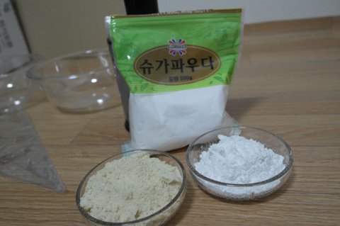 우선 아몬드가루를 믹서기에 20초정도 갈고 슈가파우더 준비해둡니다.