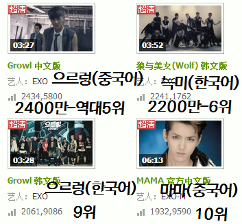 TOP10중 무려 4개가 엑소 뮤비라는말