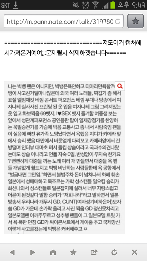 대성 사건터지고 한창 안티가 많을 때라 사칭도 많았습니다. 물론 정말 무개념들도 있었겠죠. 근데 그게 빅뱅 잘못입니까? 빅뱅 무개념 쉴드 많았지만 그 이상으로 조용히 있던 팬들도 많습니다. 지금은 꽤 많이 좋아졌구요.