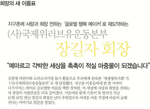 시작은 비록 작지만 그 작은 사랑이 모두가 원하는 행복한 세상을 만드는 씨앗이 될 거라 굳게 믿고 있는 장길자 회장. 초일류 복지단체, 글로벌 행복 메이커를 꿈꾸는 그의 말처럼 '국제위러브유운동본부'라는 한 알의 씨앗, 한 바가지의 마중물이 온 세상을 촉촉히 적실 사랑의 단비가 되리라 믿어본다.