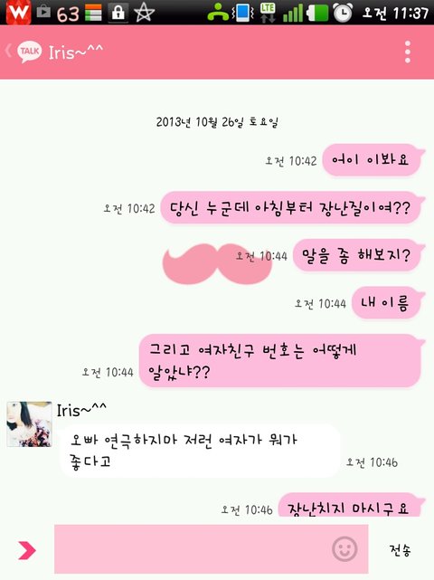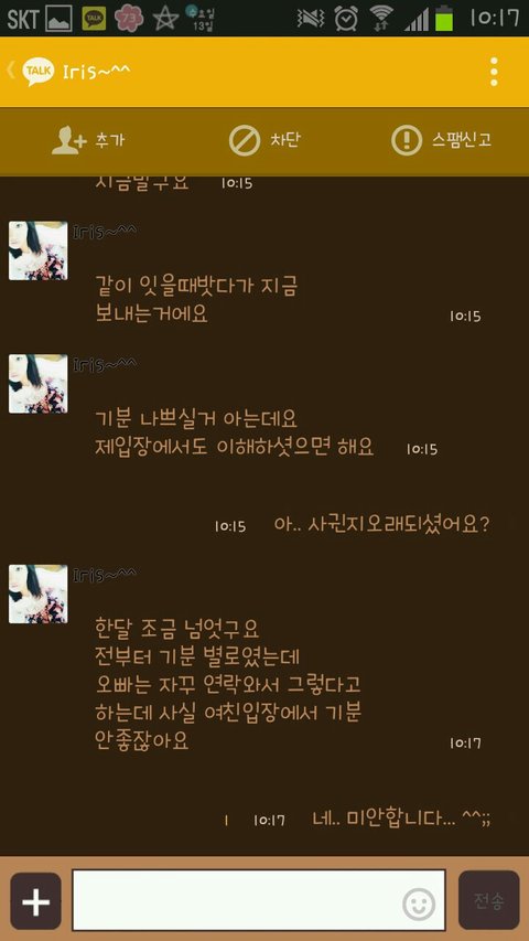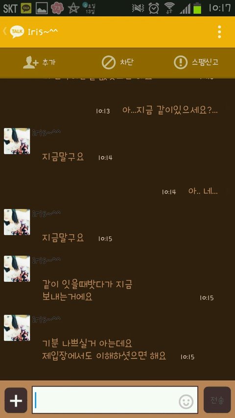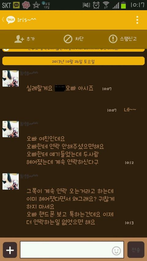 연기를 할거면 끝까지 성실하게 마무리를 지어주던지... 끝마무리를 안하고 가셨네요... 정체모를님아... 나도 모르게 나와 한달여간을 사겨주신 카톡 아이디 Iris~^^님 근데 당신 사진은 정말 제스타일이 아니였어요... 오죽했으면 사진을 보여준 제 친구들이 너 눈이 그렇게 낮아졌냐며 저에게 장난을 쳤을까요 ㅎ 어디서 저와 제 여자친구의 정보를 얻은건진 모르지만 잘 지내고 있는 커플 깰 생각하지 마시고 당신의 짝을 찾으세요. 덕분에 오늘 하루 신기한 경험을 했네요.
