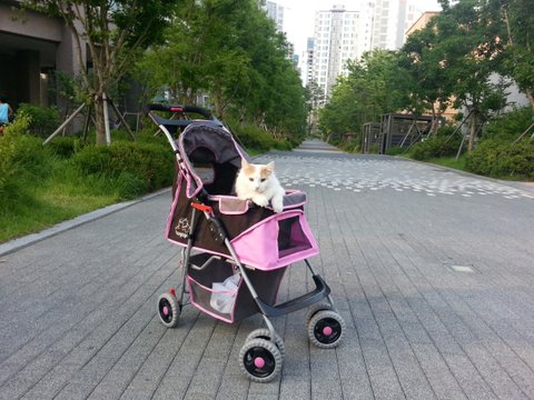 우리가 나갈 채비를 하면 자기도 데리고 가라며 유모차에 올라탐. 그래서 산책할겸 데리고 다니고 있음.
