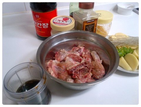- 닭은 우유나 와인 소주 콜라 등등에 1~2시간 재워두면 잡내를 잡아준다고 하는데요. 저는 생략!! 물에 한시간 정둬 담궈서 피를 좀 빼고