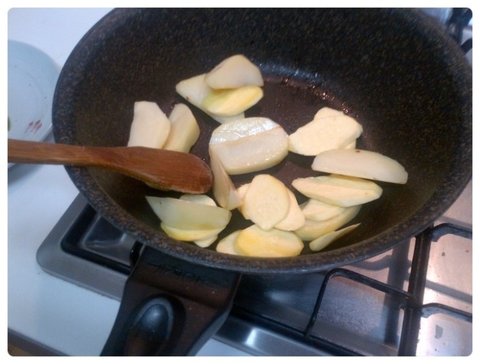일단 달군팬에 올리브오일을 넣고 감자와 고구마를 먼저 조금 익히구요.