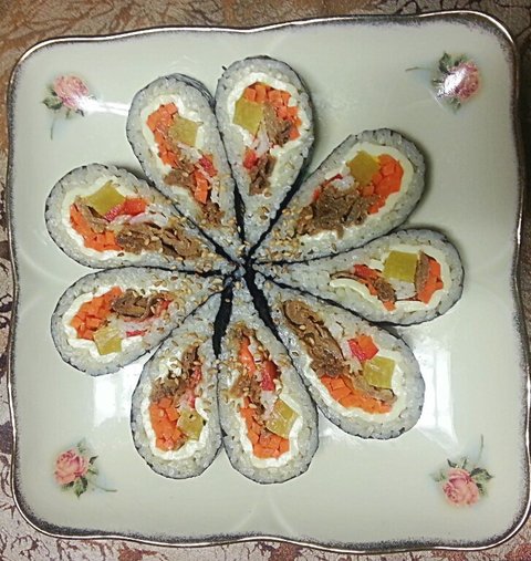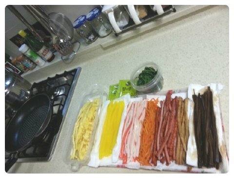 저는 김밥쌀때 모양 이뻐보이라구 김위에 밥깔구