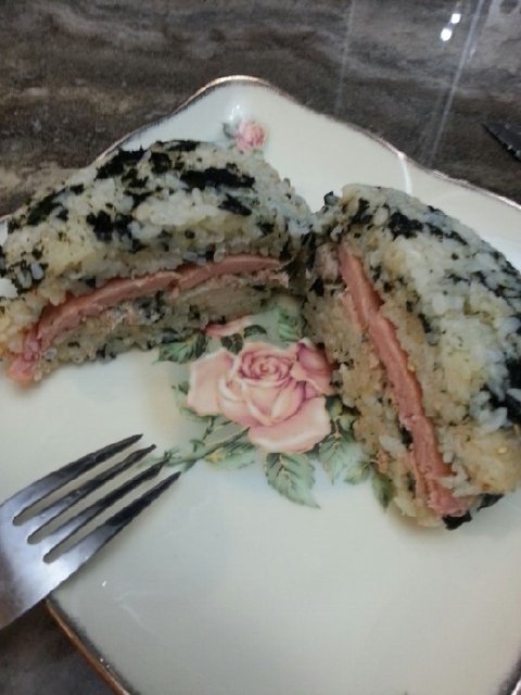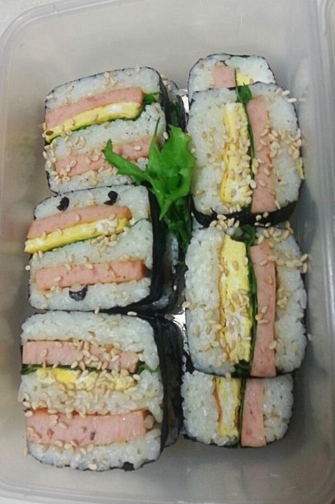 스팸틀에 랩깔구 밥.굴소스에졸인스팸.계란지단.깻잎 순으로