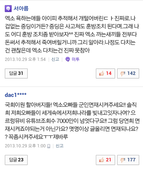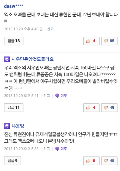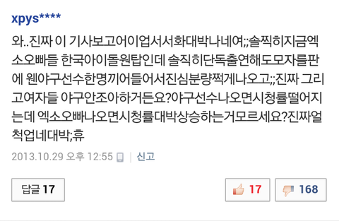 낚이는건지 일부러 같이맞장구치는건지 대댓글에다 엑소욕쓰는애들진짜;;;;;;