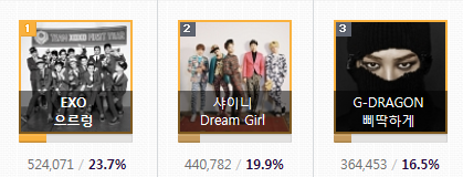 그니까 결국 저위에 지디 1위는 빂들의 힘으로 이뤄낸게 아니고 올해의음악,가수는 절대 못탄다는 사실.그리고 솔로퍼포먼스 역시 승리는 절.대 못준다는 사실..이게 아니라면 난 개쪽이게찌..저기 저거 투표수 나타낸거 맞죠?ㅋㅋㅋ