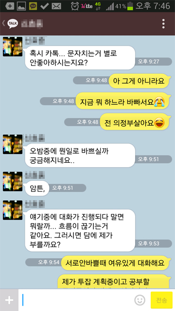 여자는 마침내 남자에게 완곡하게 상대방에 대한 부담감을 표현합니다. 최대한 돌려가며 얘기했지만 사실 여자는 여기서 남자의 연락이 자기한테는 벅차다는 뜻을 내포한 말을 한 겁니다.
