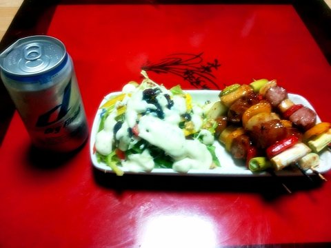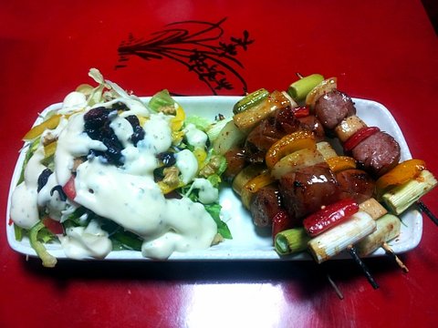 다 구운 소세지 꼬치와 마트산 샐러드에 호두와 크린베리 올려준 후에요구르트 드레싱 뿌려서