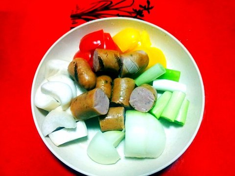 소세지는 먹기 좋은 크기로 칼집을 내어주시고요. 각각 재료들을 한입 크기로 썰어주세요