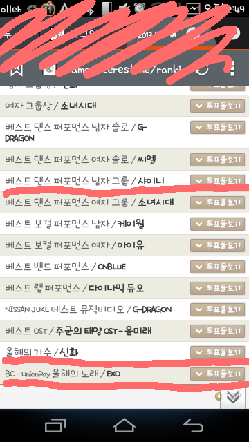 그리고 신화도 무척 좋아하는데 꼭 상받았으면 좋겠어요 ㅎㅎ 표시 해놓은게 엑소가 있는 부문이에요 매일 일회씩 투표가능해요 페이스북 계정으로도 가능 ㅎㅎ