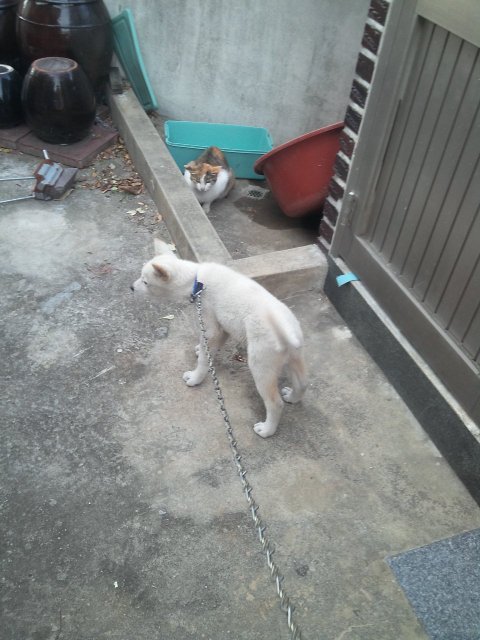 저 흰강아지는 앞집사는 앤데 주인할머니의 부탁으로 산책을 시키게되었더랬죠