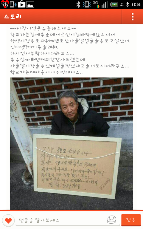요즘 카스에 떠돌아다니는 글인데요 보시다시피 할아버지께서 추운데 길바닥에서 간절하게 아들과딸을 찾고계세요 찾아주시면 고맙겠습니다! 그리고 페이스북이나 트위터,카스 등 자신의 sns에 많이 퍼뜨려주세요