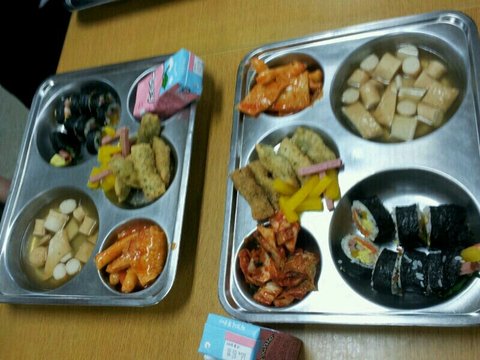 석식/분식급식이죠?ㅋㅋ! 김밥한줄과 어묵탕,떡볶이,김말이튀김?이랑 김치예요 김밥이 은근커요!