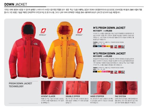 노스페이스'프리즘 구스다운자켓' 역시 하이벤트 소재를 사용해 발수, 방풍 및 투습 기능을 극대화했다. 800필파워의 최상급 구스 다운을 적용, 열 손실이 많고 체온유지가 필요한 머리와 가슴 부분에 다운 양을 보강해 보온 기능을 높였다. 후드 뒷부분에는 후드 스토퍼(HOOD STOPPER)를 달아 시야 확보의 용이성과 착용감, 밀착감을 배가시켰다. 또 풍부한 볼륨감과 이에 따른 공기층 확보로 보온성을 높였으며, 부드러운 안감을 사용해 착용시 다운의 볼륨이 신체의 굴곡을 따라 감싸주어 한결 포근하다.