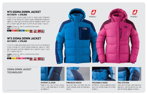 노스페이스 '시그마 구스다운자켓'은 경량 하이벤트 2L 소재를 사용한 700필파워의 구스 다운 재킷으로 가벼운 착용감과 활동성을 자랑한다. 다운이 겉감 밖으로 빠져나오지 않도록 가공처리하는 다운 프루프 기술을 통해 보온성을 배가시켰다. 또 탈부착이 가능해 별도의 수납주머니에 보관할 수 있는 후드 부분에도 다운을 충전해 보온성을 높였으며, 어깨 부분에 보강원단을 적용하여 내마모성을 높였다. 이너 카라에 보온력과 착용감을 높이기 위해 하이로프트 플리스 소재를 사용했으며, 날씬해 보이면서도 여유 있는 실루엣으로 여러 겹의 의류와 함께 입어도 활동에 지장을 주지 않는다
