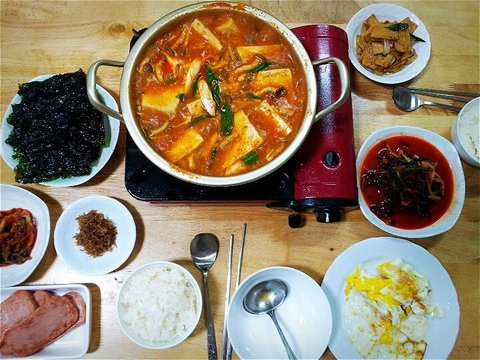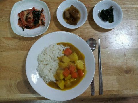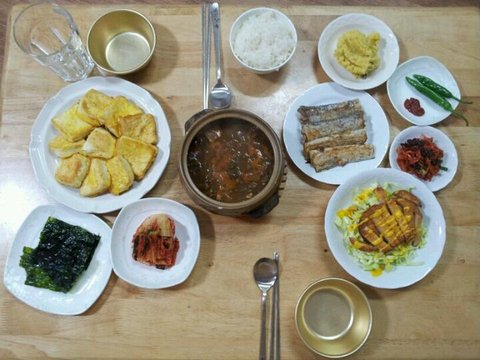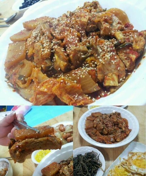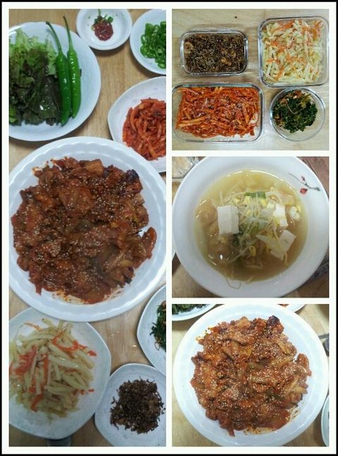 제육볶음&황태해장국&멸치조림&무생채&감자볶음&냉이무침이던가??ㅋㅋ
