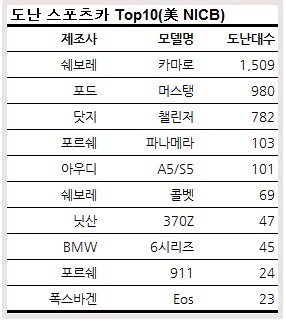 미국에서 가장 많이 도난을 당한 스포츠카는 쉐보레 카마로인 것으로 나타났다. 미국보험범죄방지국(NICB)이 최근 발표한 자료에 따르면 카마로는 지난 2009년부터 2012년 사이에 1509대의 도난 신고가 접수돼 차량 절도범들이 가장 선호하는 스포츠카 1위에 이름을 올렸다.