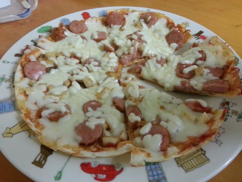 소시지 또띠아 피자에요.. 갠적으로 치즈 크러스트는 좀 질려서 끝이 바삭한 또땨피자가 더 맛나다는~♥