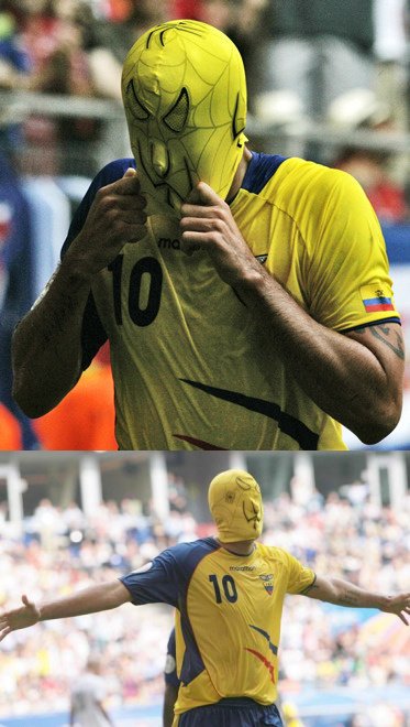 경기 막판 3:0으로 쐐기골을 박은 카비에데스는 갑자기 우스꽝스러운 스파이더맨 가면을 쓰고