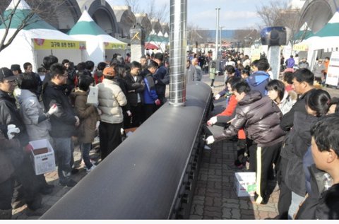 여주오곡나루축제에서는 초대형 고구마 굽기 통에 하루 200박스를 구어