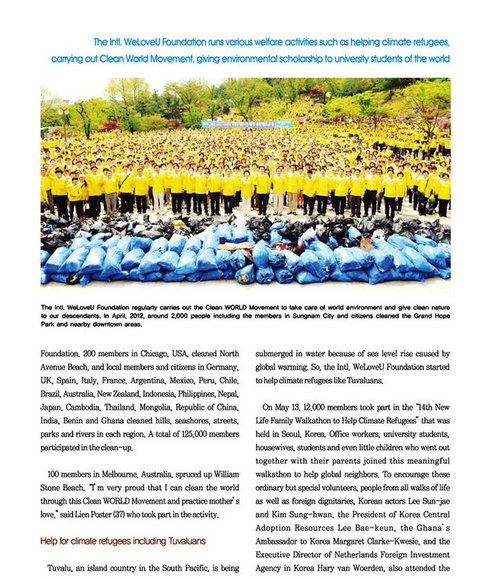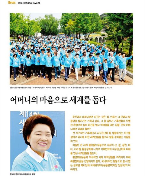 이들은 '어머니의 사랑을 온 세상에 전한다'는 목표로 전 세계 클린월드운동을 전개해 각국의 산, 강, 공원, 바다, 거리 등 환경정화에 나서는가 하면, 깨끗한 물이 부족한 나라에 물펌프를 설치하고, 남태평양 섬나라 투발루 등 기후변화로 피해를 입은 세계인들을 돕는 장을 마련하기도 한다. 환경보호운동에 적극적인 세계대학생들을 격려하고자 특별장학금도 전달한다.